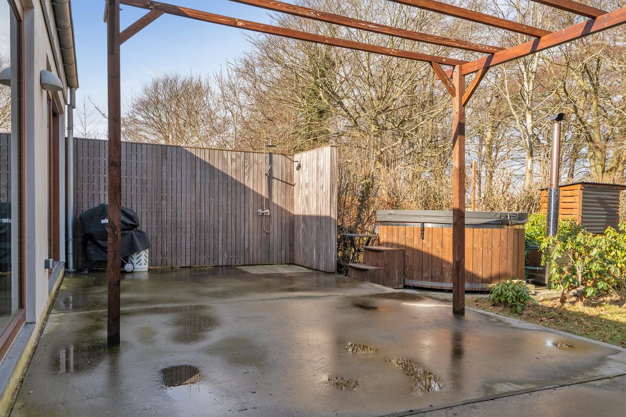 Udenfor venter en hyggelig og velanlagt have med flere flotte terrassearealer, hvor solen kan nydes dagen lang. Som prikken over i’et finder I et vildmarksbad - perfekt til afslapning året rundt. Haven grænser direkte op til det grønne område, hvilket giver en helt særlig ro og luft omkring ejendommen.