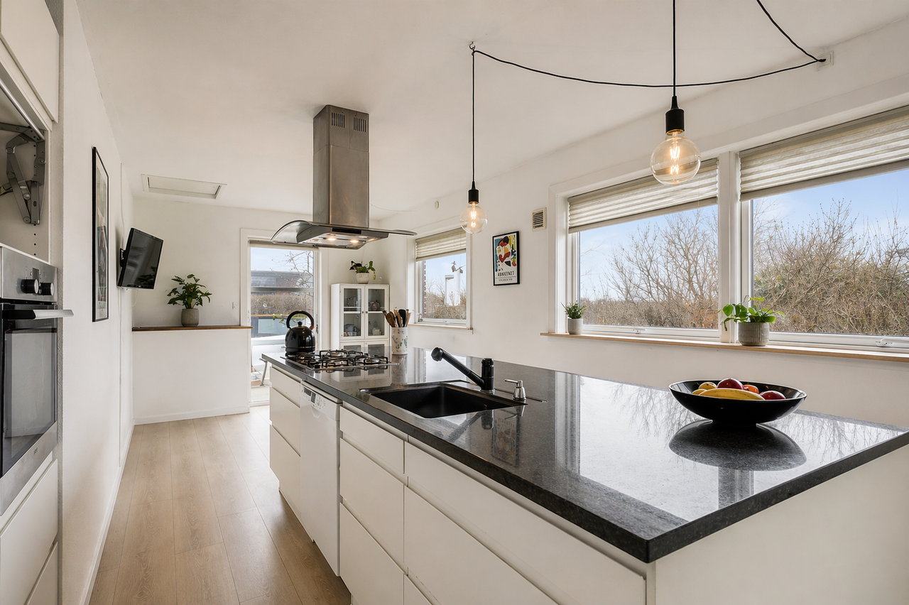 Man bydes velkommen i entréen med klinkegulv og god plads til overtøj. Herfra er der adgang til husets badeværelse med bruseniche. Køkken/alrummet fremstår lyst og moderne med god skabsplads, køkkenø og flot lysindfald fra vinduerne – et naturligt samlingspunkt i hverdagen. Køkkenet ligger i direkte forbindelse med den store opholdsstue, og der er mulighed for at etablere mere åben planløsning, hvis ønsket.