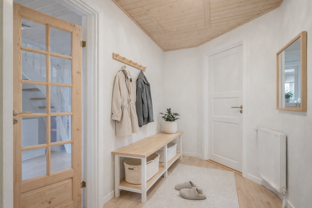 Entre. Stort soveværelse med skabe. Dejligt stort og lyst badeværelse med bruseniche og gulvvarme. Stor stue og spisestue. Herfra er der videre adgang til hyggeligt køkken. Skulle drømmen være et stort køkken/alrum, så ligger køkkenet lige ved siden af stuen og derfor skulle der være en god mulighed for at etablere dette. Bryggers med installation til vaskemaskine og tørretumbler. Herfra er der videre udgang til haven.
