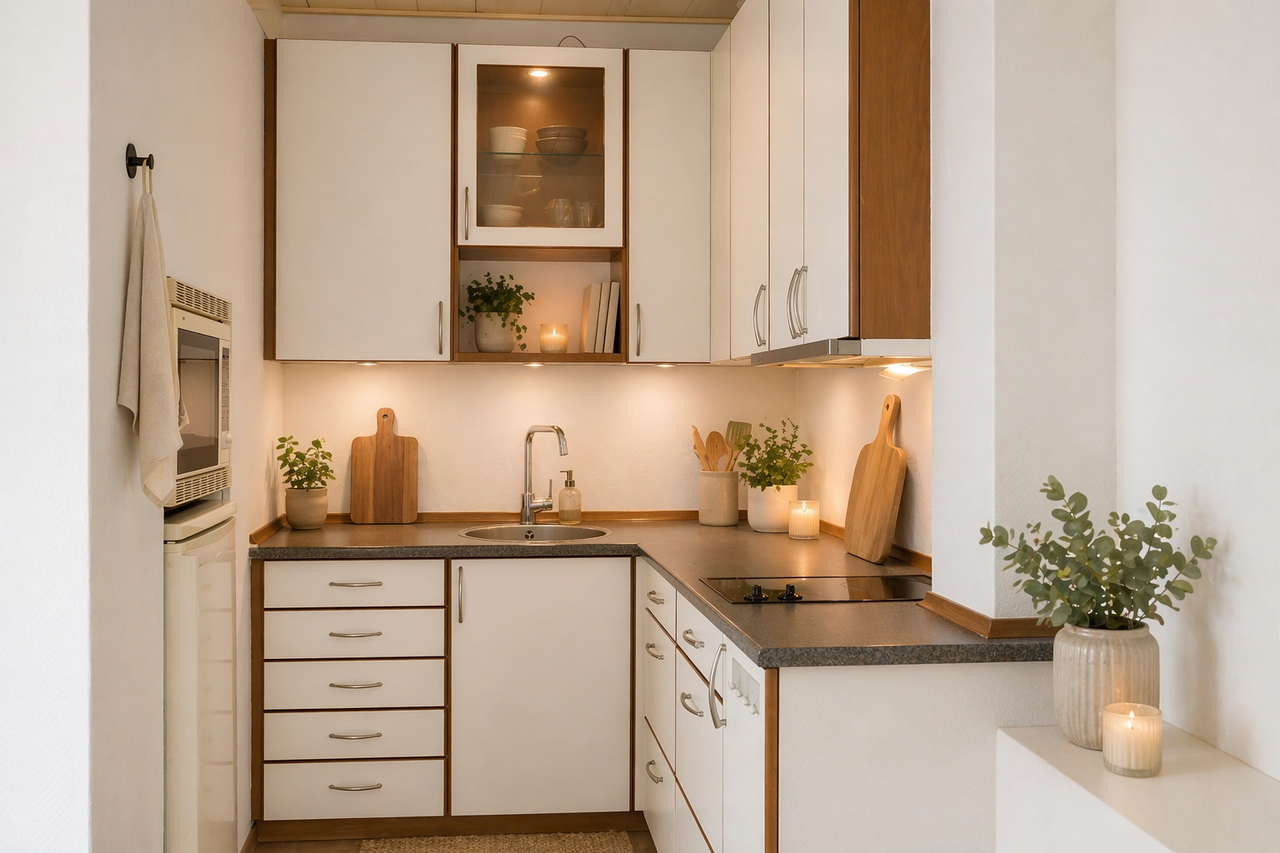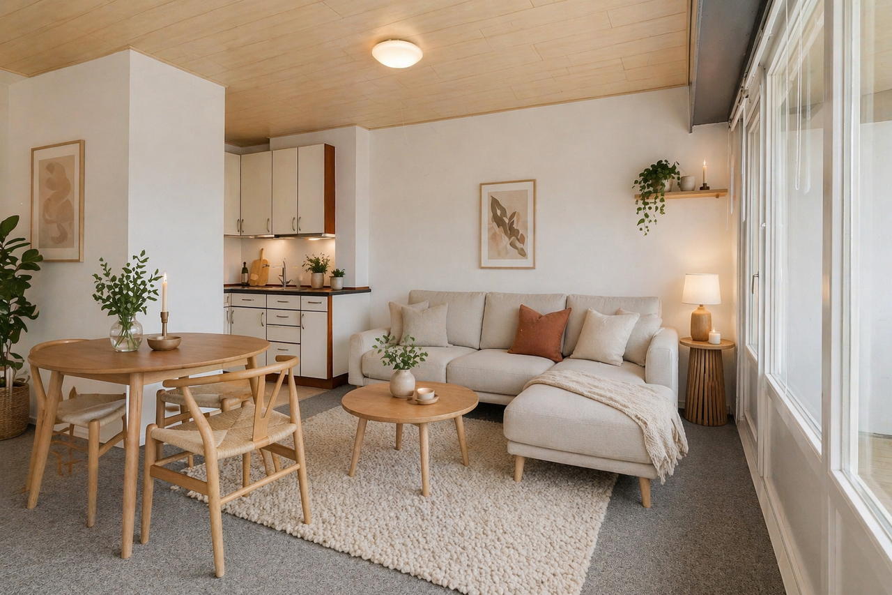 Lejligheden byder på et pænt og funktionelt køkken med gode opbevaringsmuligheder samt en naturlig forbindelse til stueområdet, hvor der er plads til både sofaarrangement og seng. De store vinduespartier giver et dejligt lysindfald og skaber en lys og indbydende atmosfære.