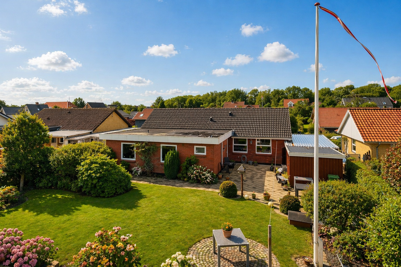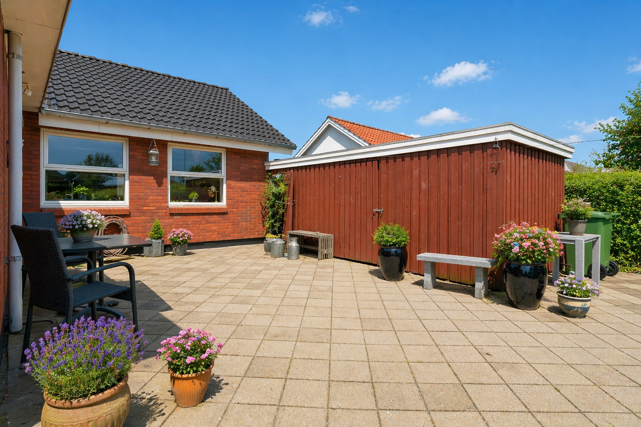Udvendigt får du en nem og overskuelig grund med flisebelagt indkørsel, carport og redskabsrum. Haven og terrasserne indbyder til afslapning, leg og hyggelige grillaftener.