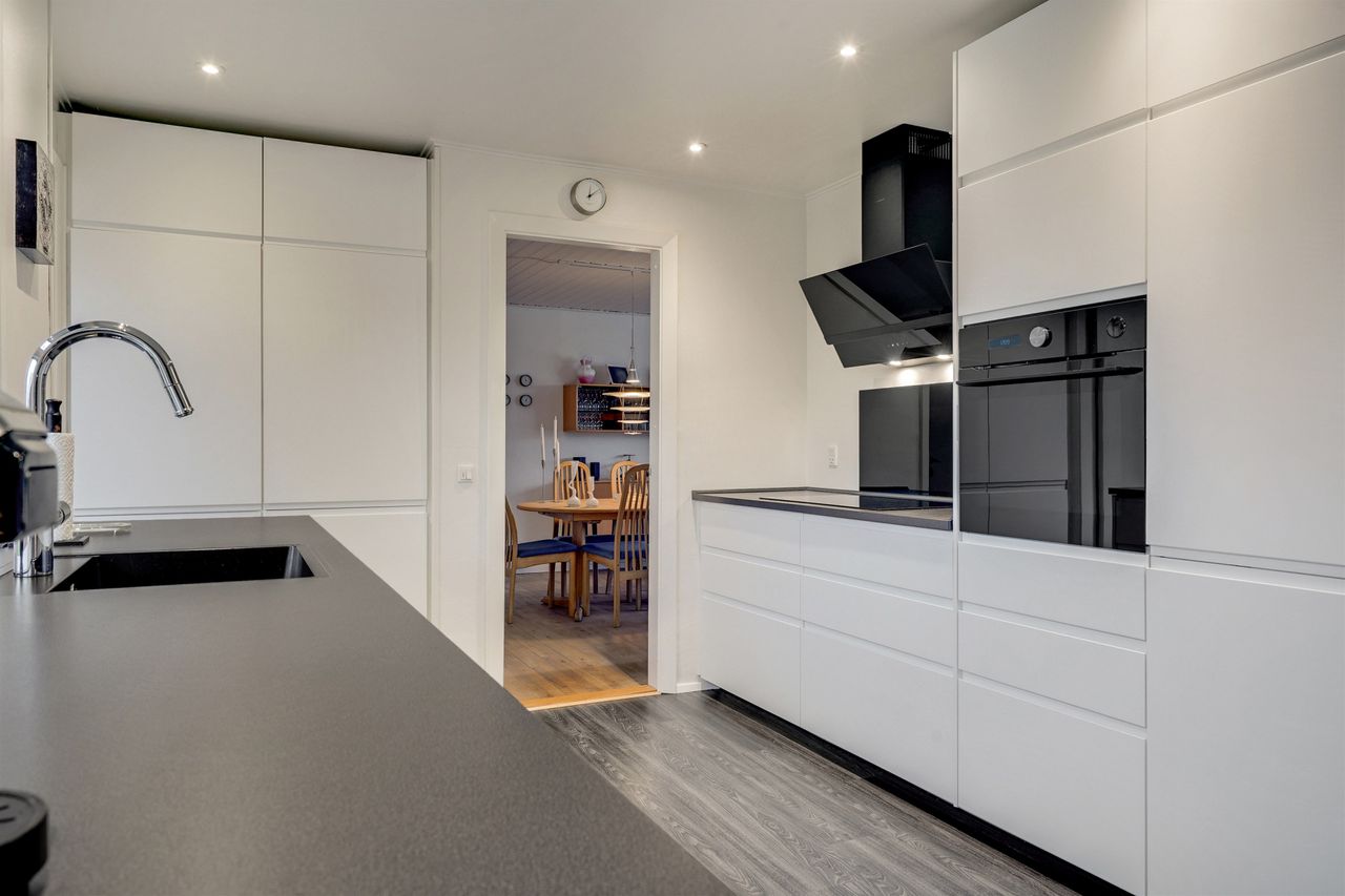 Køkkenet fremstår moderne og stilrent med god skabs- og bordplads samt spiseplads til hverdagen. Her er en praktisk sammenhæng til resten af boligen, hvilket gør køkkenet ideelt til både familieliv og gæster.