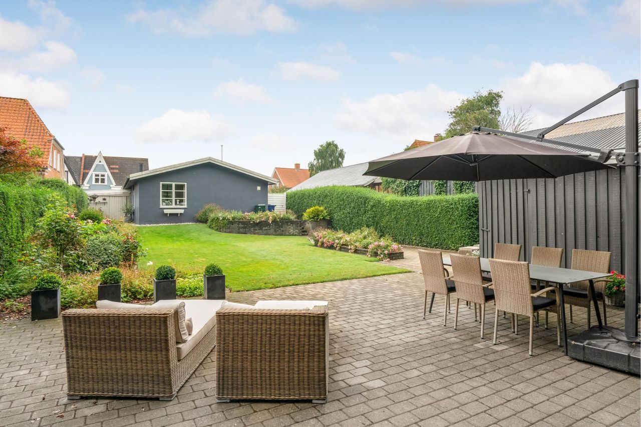 Endvidere tilhørende den hyggeligste have, med flotte gamle træer, gode terrassearealer, samt god