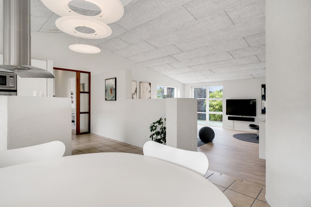 I husets centrum finder I et skønt og åbent køkken/alrum med loft til kip - det perfekte samlingspunkt for både hverdag og weekend. Herfra er der adgang til en nedsænket og hyggelig stue med direkte udgang til den solrige terrasse og den ugenerede have.
