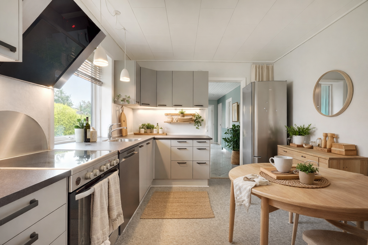 Fremstår i pæn stand og er løbende moderniseret, og her vil være rigtig god mulighed for at åbne op fra køkkenet til den store stue. Mulighederne er mange.