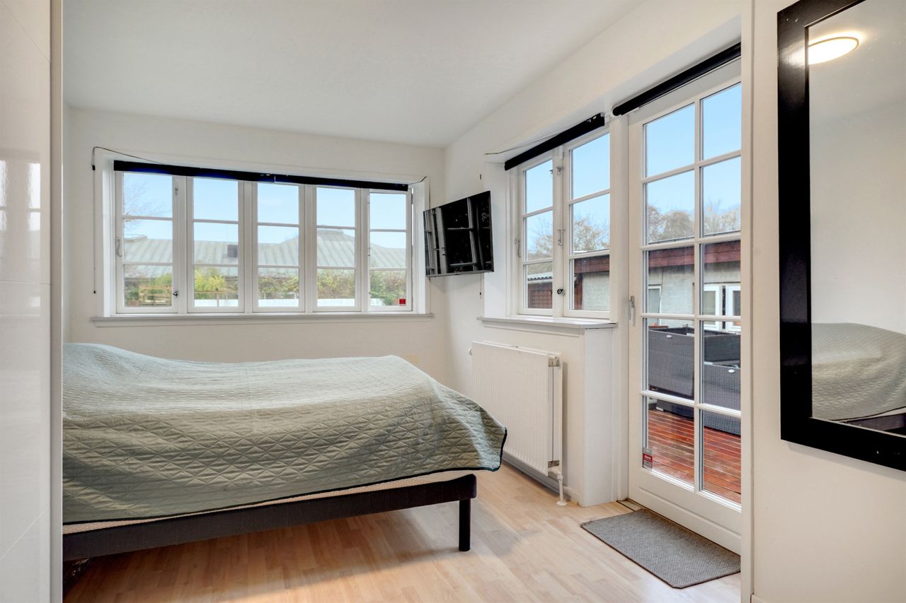 Fra spisestuen er der adgang til yderligere to værelser, og via køkkenet fortsætter man ud i baghuset. Her finder du både udgang til den dejlige, hævede træterrasse - et privat lille fristed helt i læ - samt et flot, nyere badeværelse med bruseniche og plads til vaskesøjle.