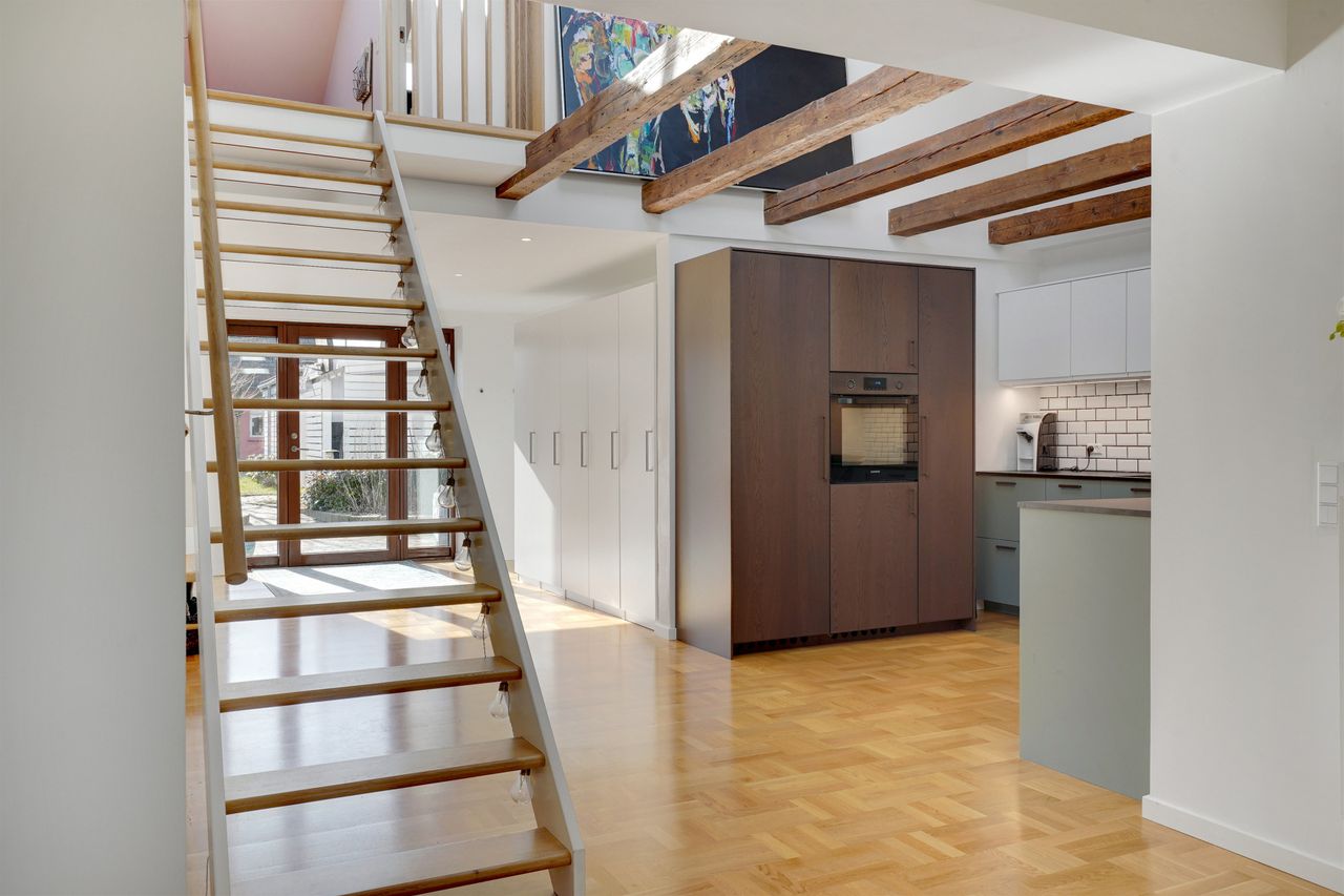 Husets hjerte er det åbne køkken- og opholdsmiljø med imponerende loft til kip og synlige bjælker, der skaber en fantastisk rumfornemmelse og et smukt lysindfald. Her er der plads til både hverdag og gæster - og direkte udgang til skønne terrassemiljøer.