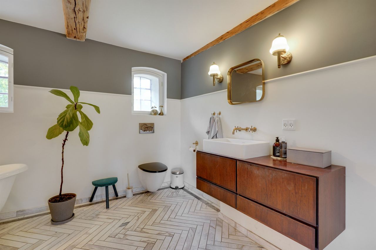 Indenfor bydes du velkommen i en lys og rummelig entré med en smuk trappe, der fører dig til førstesalen. Badeværelset i stueplan er stilfuldt indrettet med lækre materialer og et eksklusivt udtryk.
