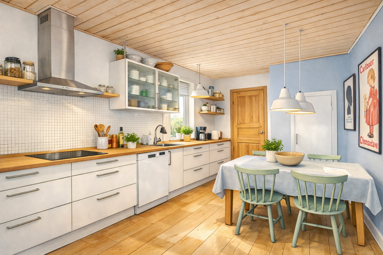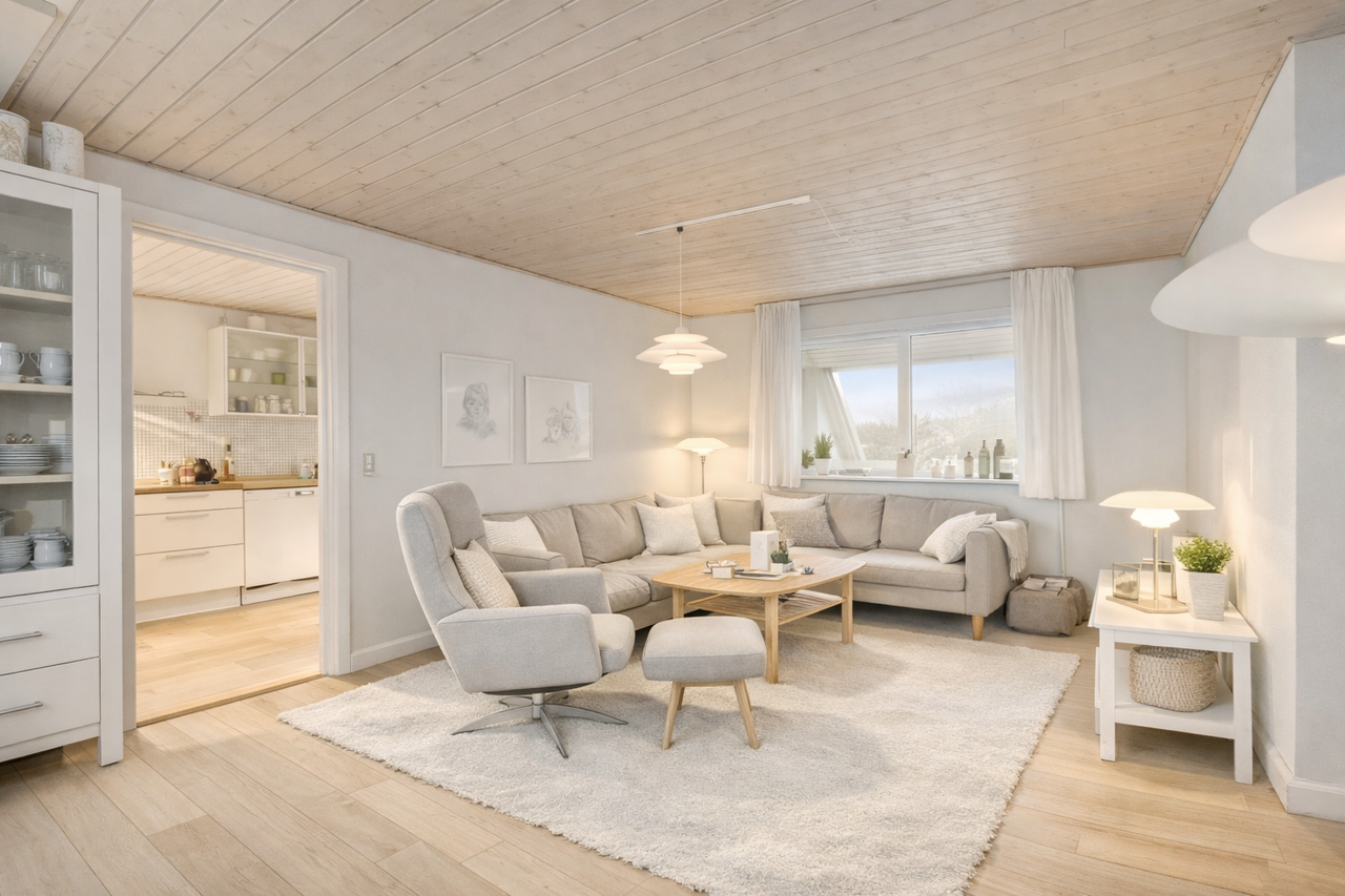 Entre. Stort soveværelse med skabe. Dejligt stort og lyst badeværelse med bruseniche og gulvvarme. Stor stue og spisestue. Herfra er der videre adgang til hyggeligt køkken. Skulle drømmen være et stort køkken/alrum, så ligger køkkenet lige ved siden af stuen og derfor skulle der være en god mulighed for at etablere dette. Bryggers med installation til vaskemaskine og tørretumbler. Herfra er der videre udgang til haven.