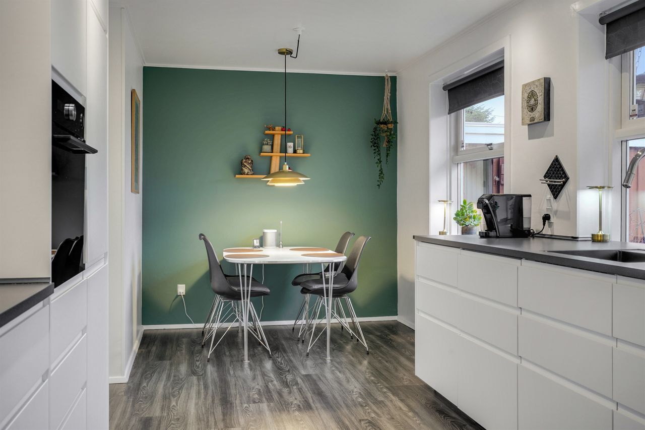 Køkkenet fremstår moderne og stilrent med god skabs- og bordplads samt spiseplads til hverdagen. Her er en praktisk sammenhæng til resten af boligen, hvilket gør køkkenet ideelt til både familieliv og gæster.