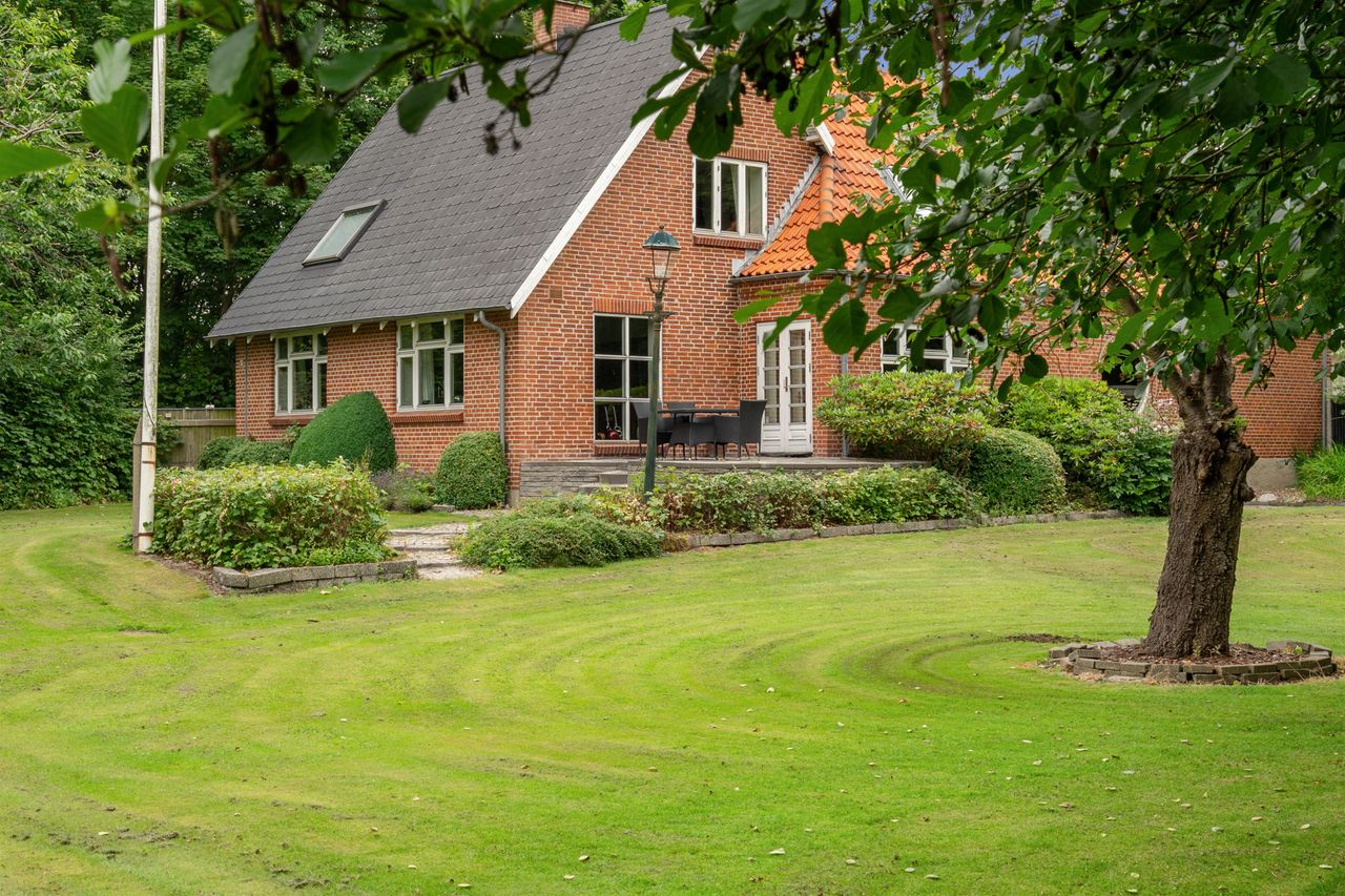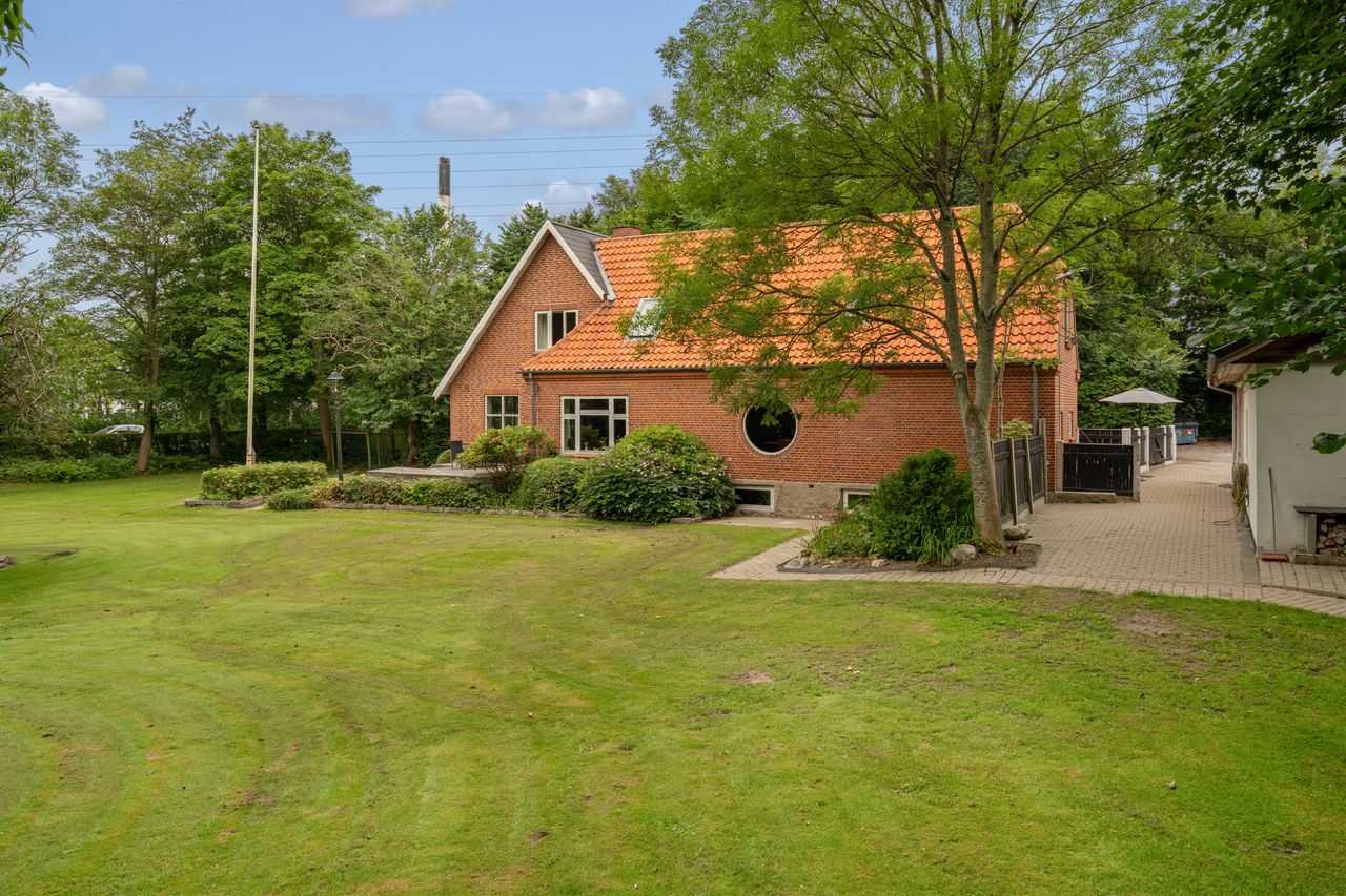 Pt. har man en grund på 5261 m2 som er omkranset af smukke gamle træer. Boligen med et imponerende etageareal på 256 m2, samt en stor garage/værksted på 85 m2.